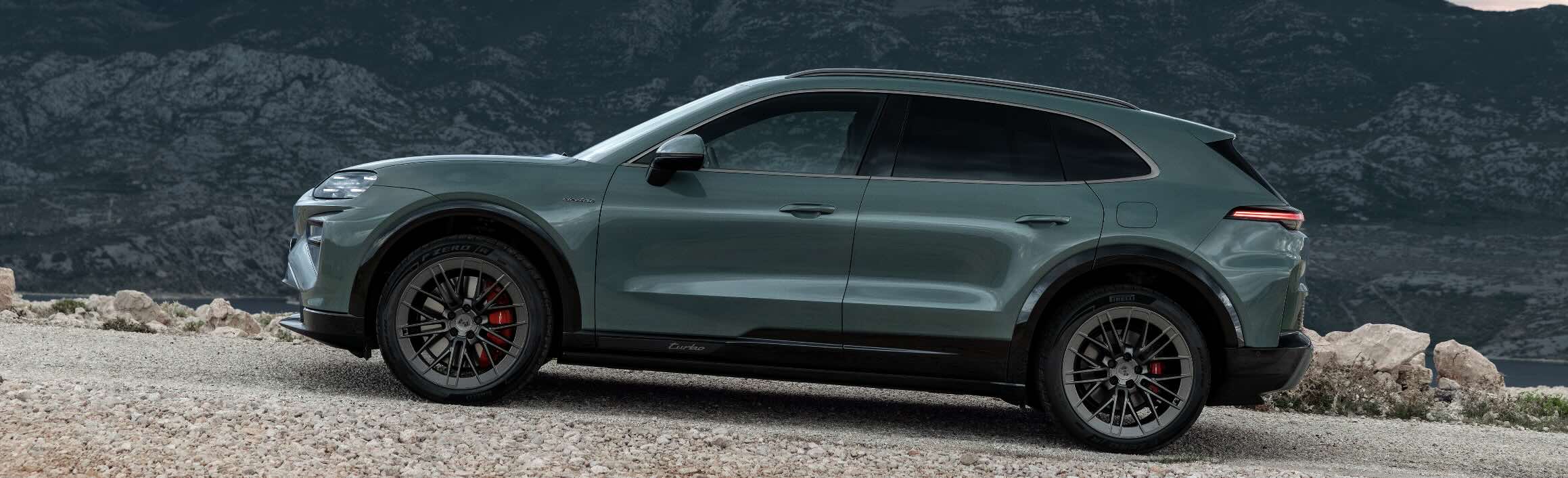 Külgvaadet ilmestavad aknaraamideta uksed ja rõhutatud rant uksepinnal. Küljekarpidel on iseloomulik ruumiline disain ning need on värvitud metallikhalliks (Volcanic Grey Metallic) või Cayenne Electric Turbo korral läikivmustaks. Kahetooniline värvikontseptsioon rõhutab auto sportlikke proportsioone. Mudelikohased rattakoopaservad toovad esile sõiduki maastikusuutliku iseloomu. Kaasaegset disainikeelt rõhutavad sellised tagaosa elemendid nagu iseloomuliku ruumilise kujunduse ja animeeritud graafikaga valgusliist, samuti valgustatud kiri „PORSCHE“. Cayenne Electric Turbo saab ka mitmed kontrasttoonis elemendid, kus kasutatakse eksklusiivset värvitooni Turbonite. Nende hulka kuuluvad Porsche vapid, valuvelgede välisküljed ja küljeakende raamid. Turbonite-toonid delikaatsed aktsendid täiendavad samuti valgusliistu ja kirja „PORSCHE“.